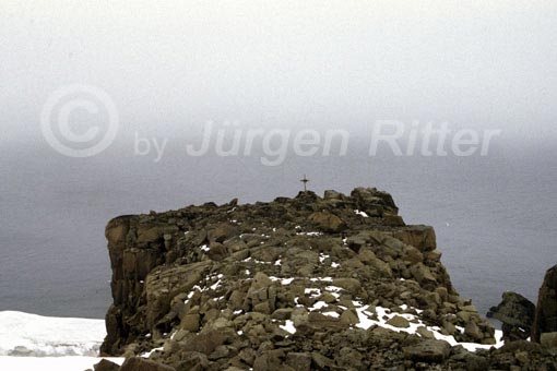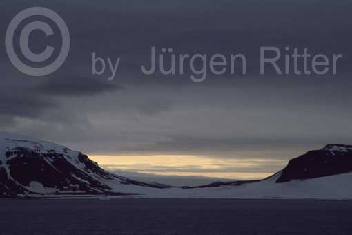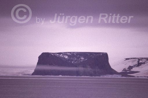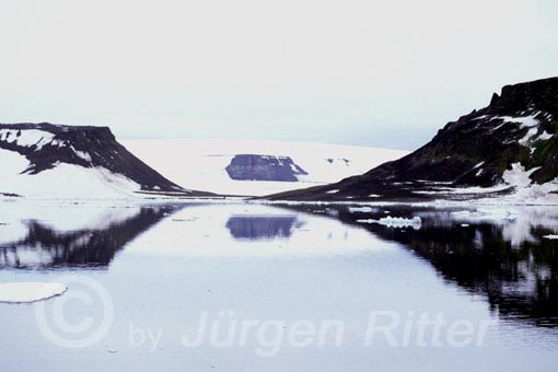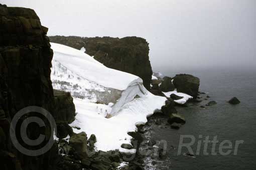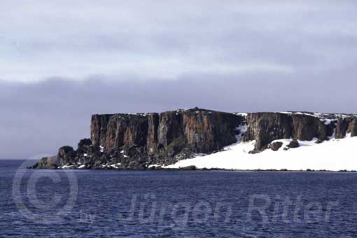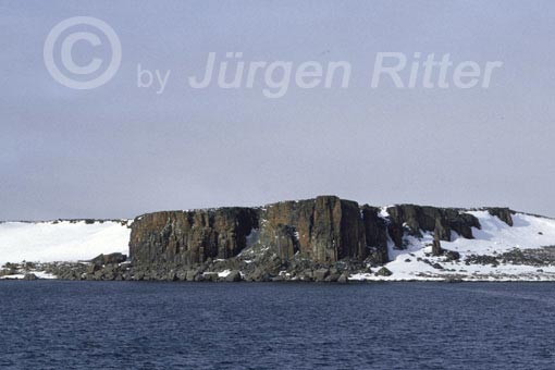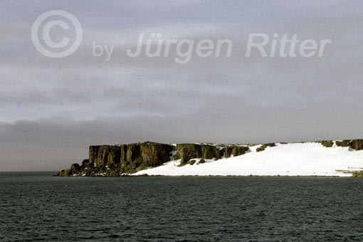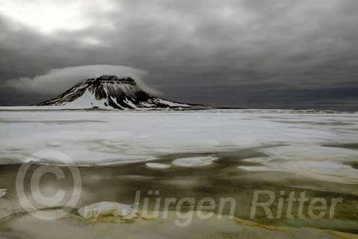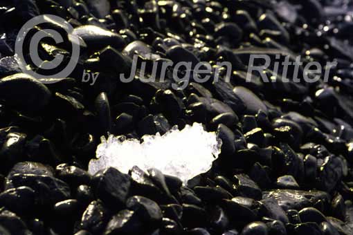 Eis zwischen schwarzen Strandsteinen auf der Insel Wilczek
